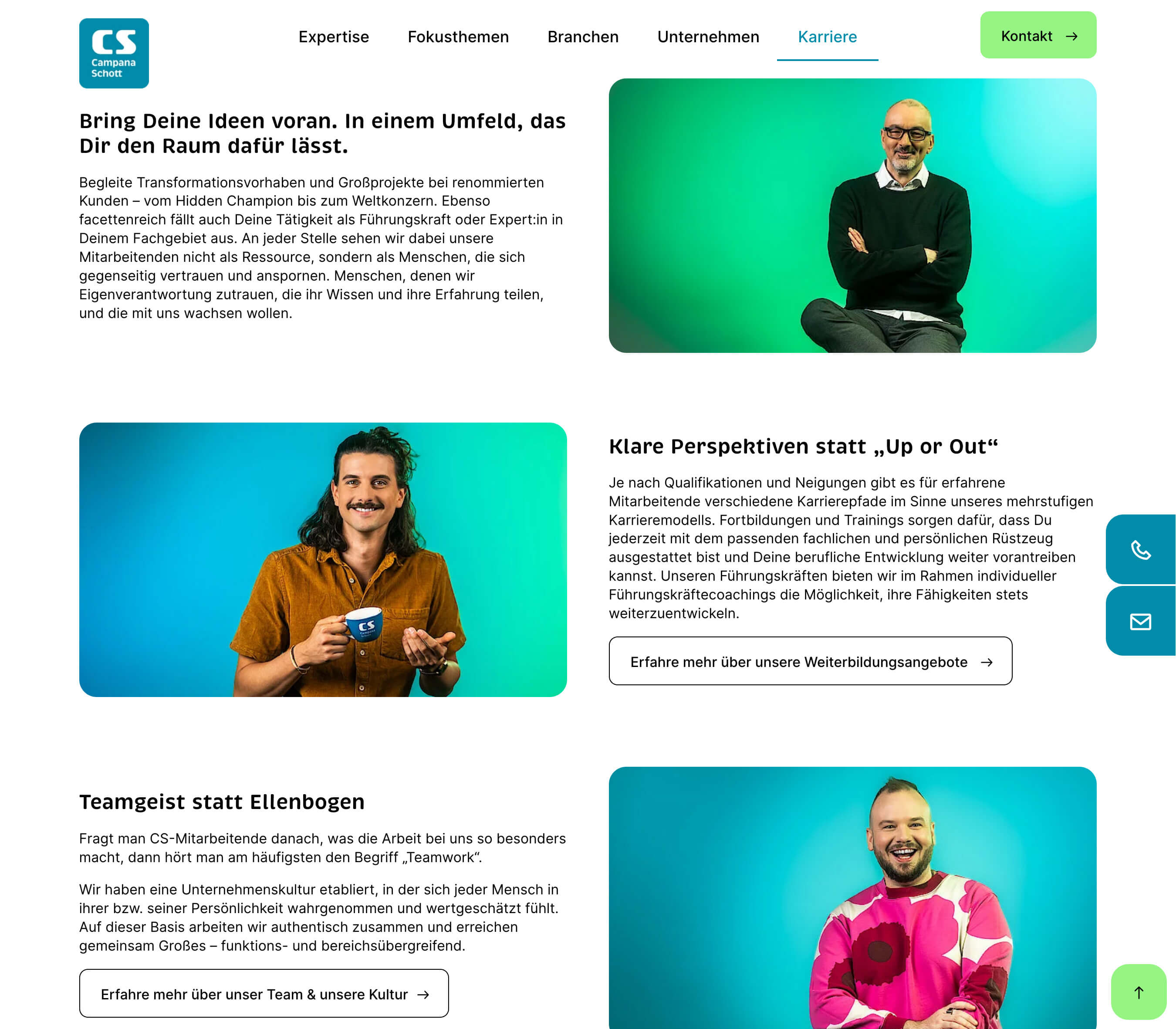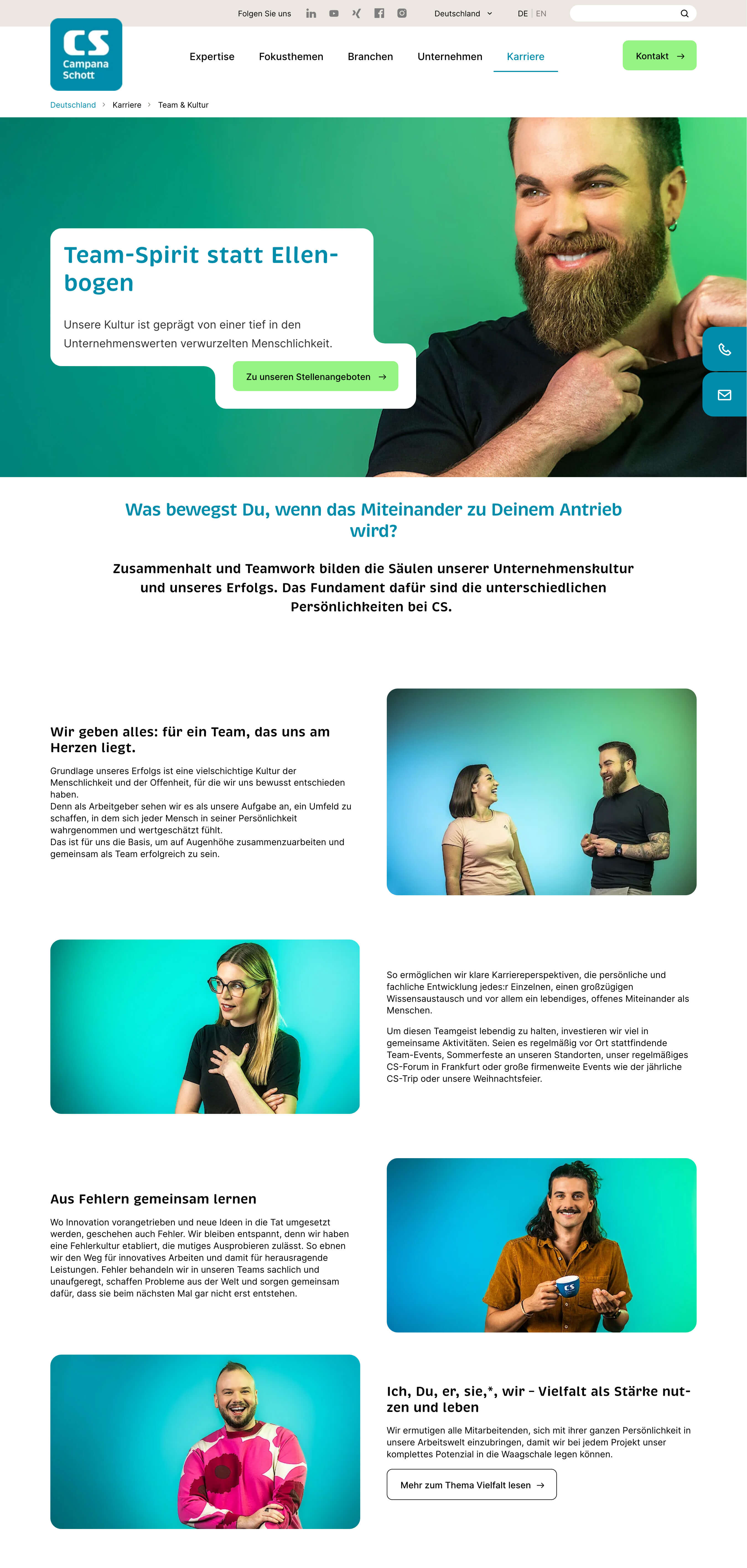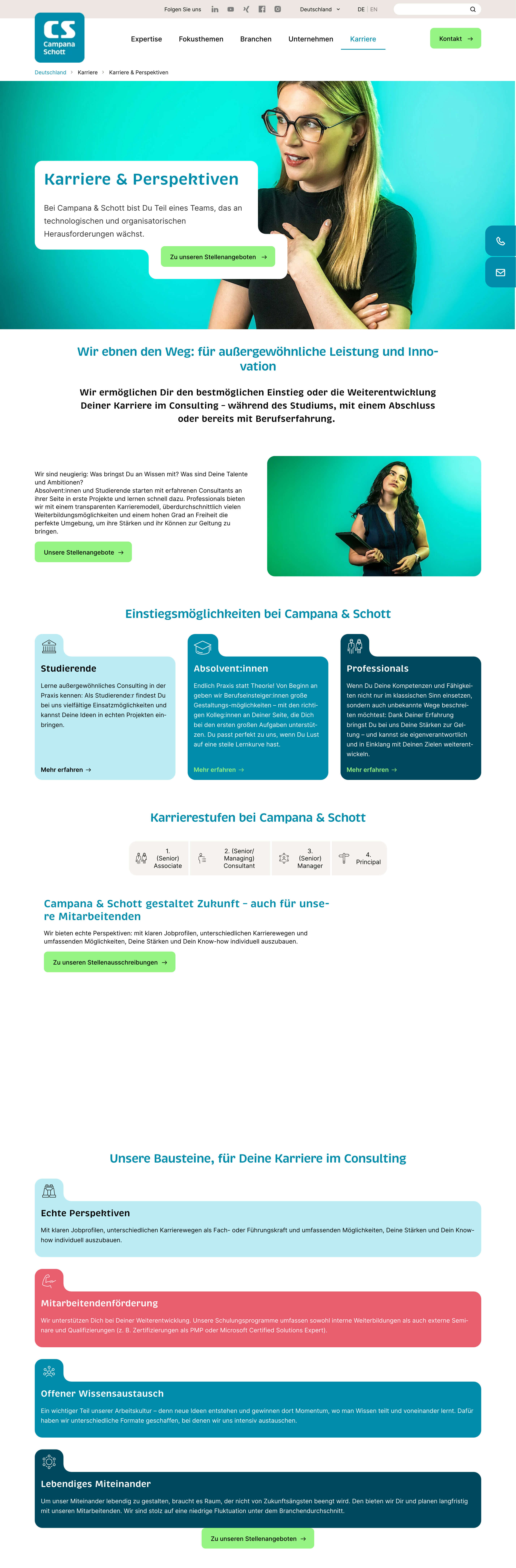 Campana & Schott is an international management and technology consultancy focused on digitalisation, new work, and transformation. We revised the careers page copy for the employer brand “Working with us: Just be.”, with a clear emphasis on personality, a people-first culture, and attractive development and career opportunities.
