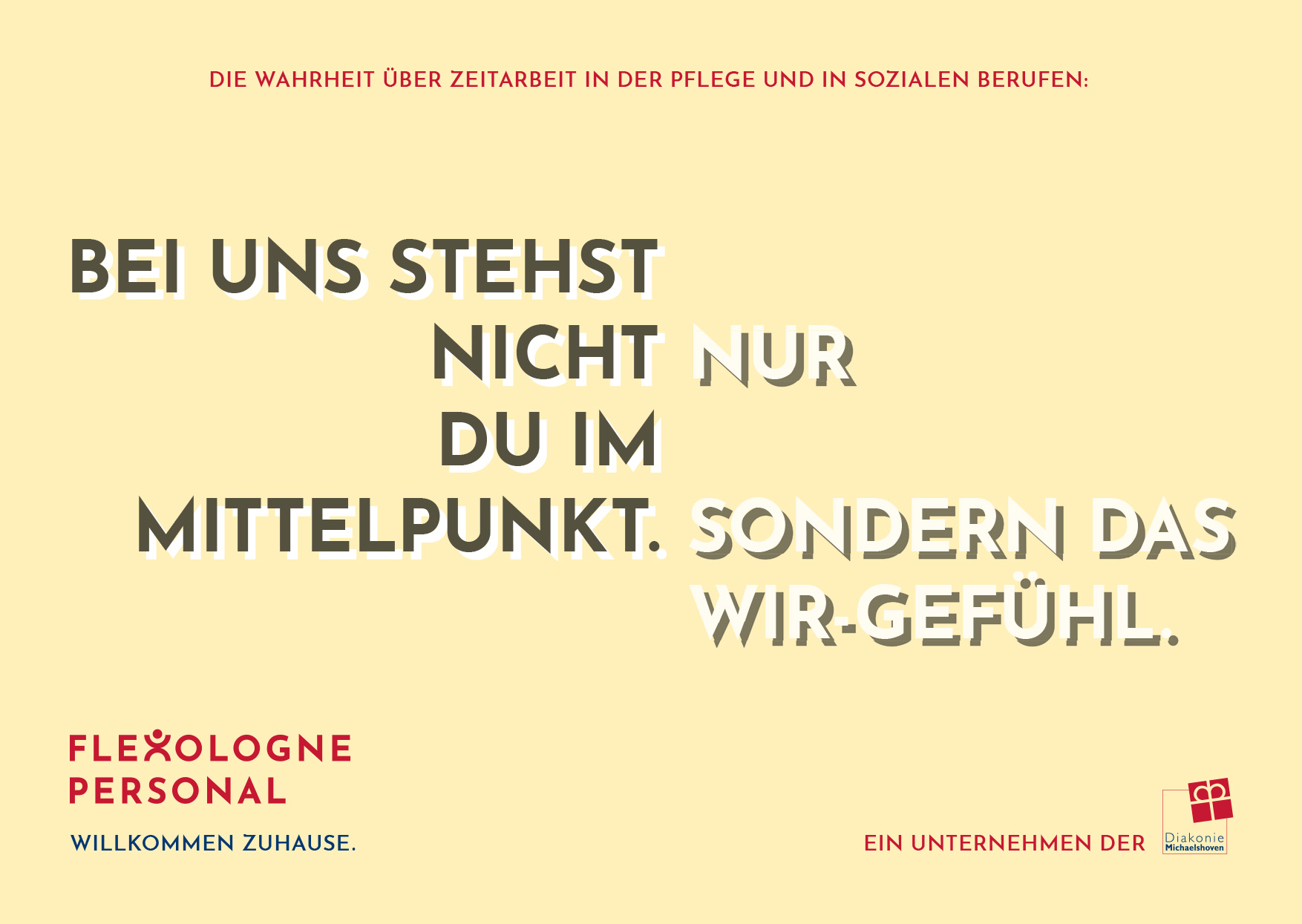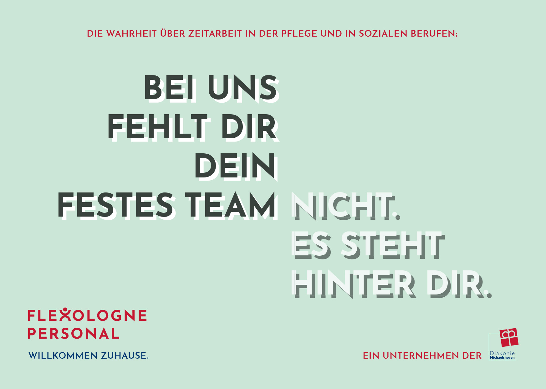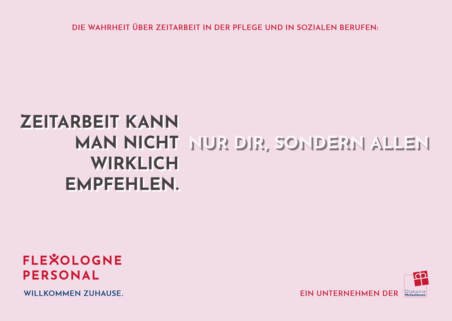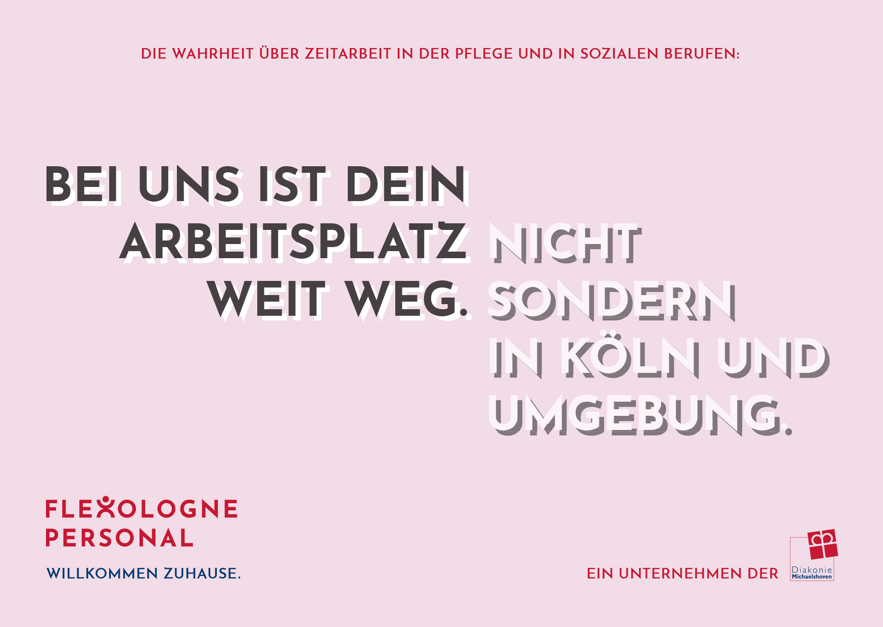 Flexologne Personal is the temporary staffing brand of Diakonie Michaelshoven, placing qualified professionals in nursing and social care roles in and around Cologne—with the aim of rethinking temp work and offering employees a true professional home. As freelancers, we developed campaign headlines built on a creative mechanic that picks up common prejudices about temporary staffing and sharply counters them with Flexologne’s value proposition. Building on that, we also conceptualized and delivered the website’s structure and copy.
