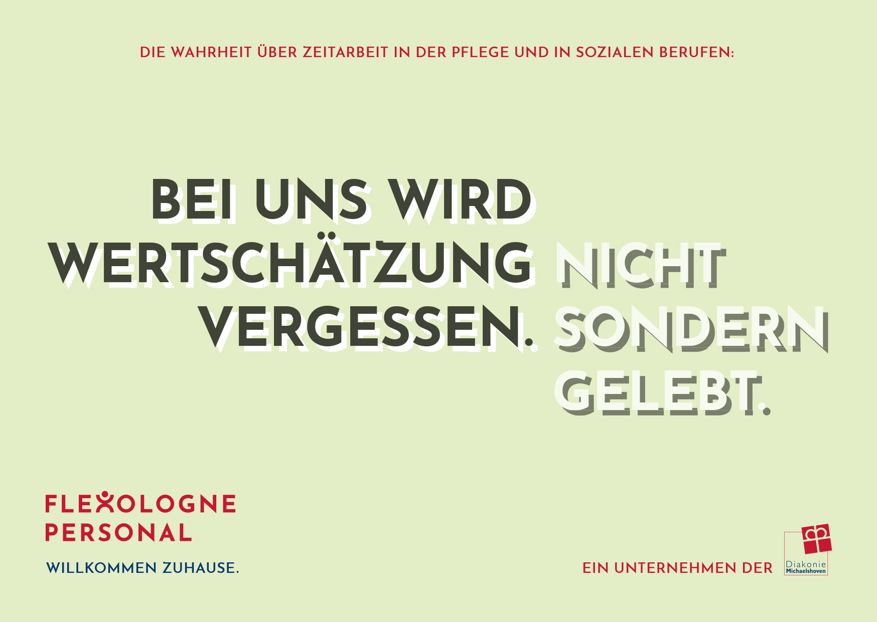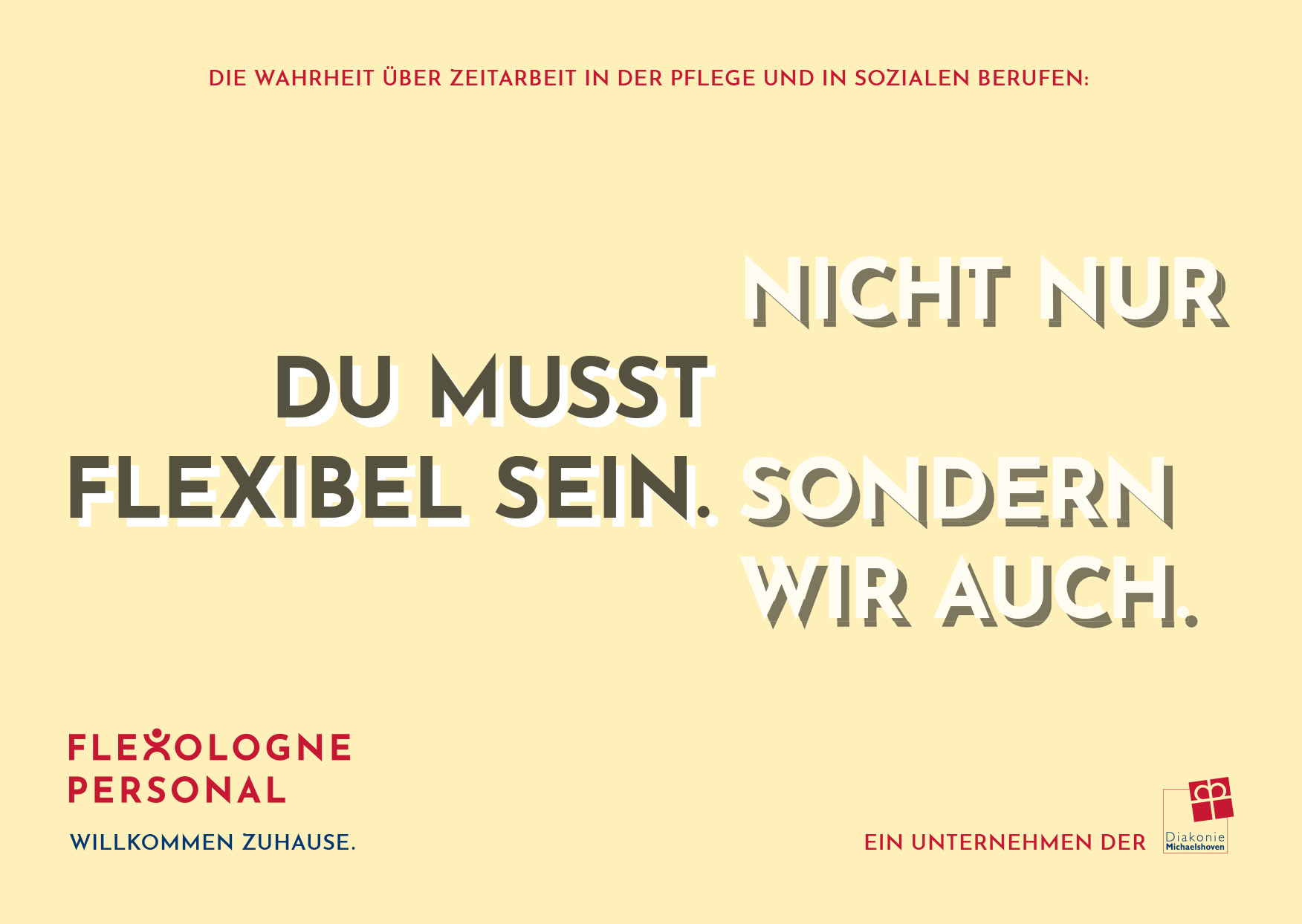 Flexologne Personal ist die Zeitarbeitsmarke der Diakonie Michaelshoven und vermittelt Fachkräfte in Pflege- und Sozialberufen in Köln und Umgebung – mit dem Anspruch, Zeitarbeit neu zu denken und Mitarbeitenden ein berufliches Zuhause zu geben. Als Freelancer haben wir Kampagnenheadlines für eine Mechanik entwickelt, die gängige Vorurteile über Zeitarbeit aufgreift und den Mehrwert von Flexologne pointiert dagegenstellt. Darauf aufbauend haben wir außerdem Struktur und Texte der Website konzipiert und umgesetzt.