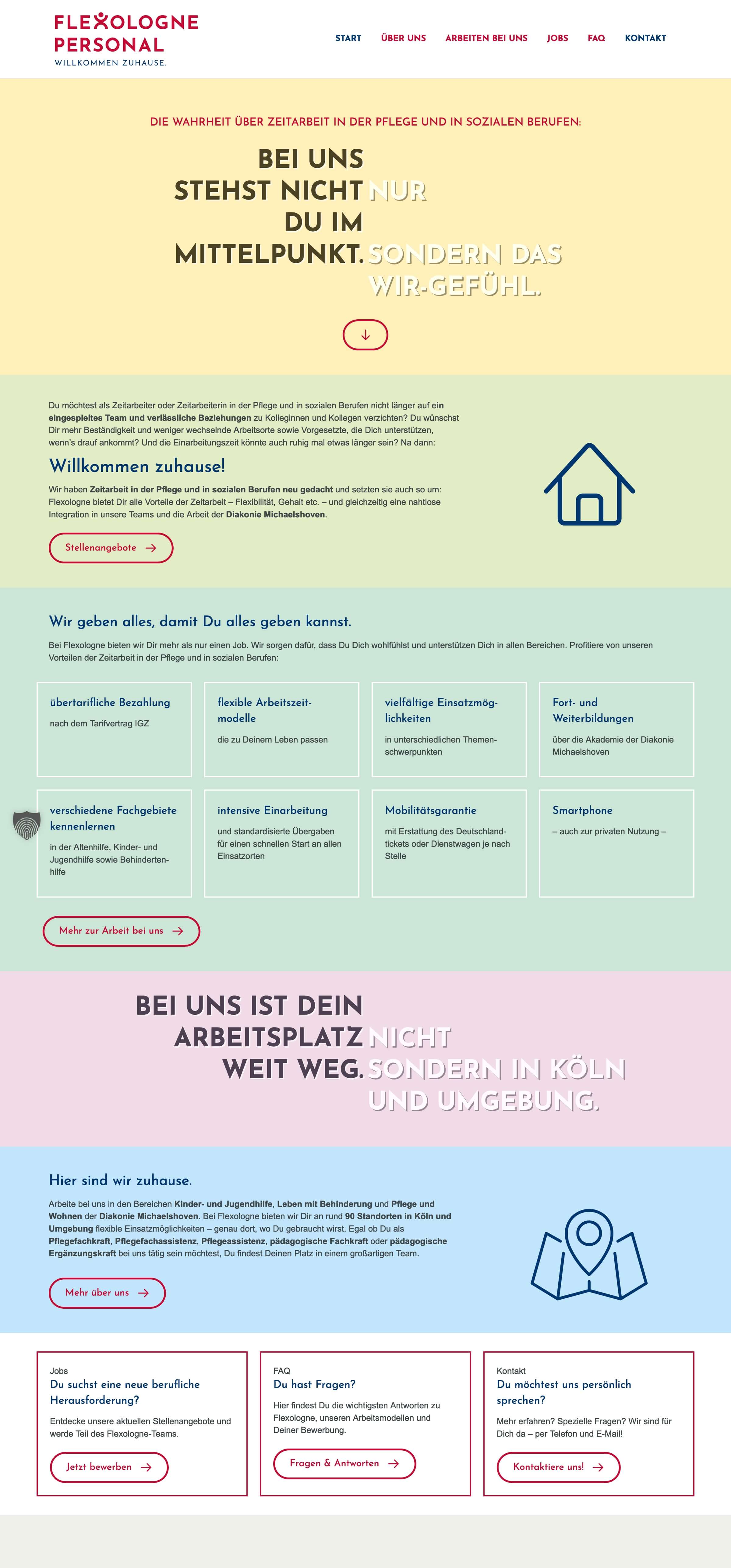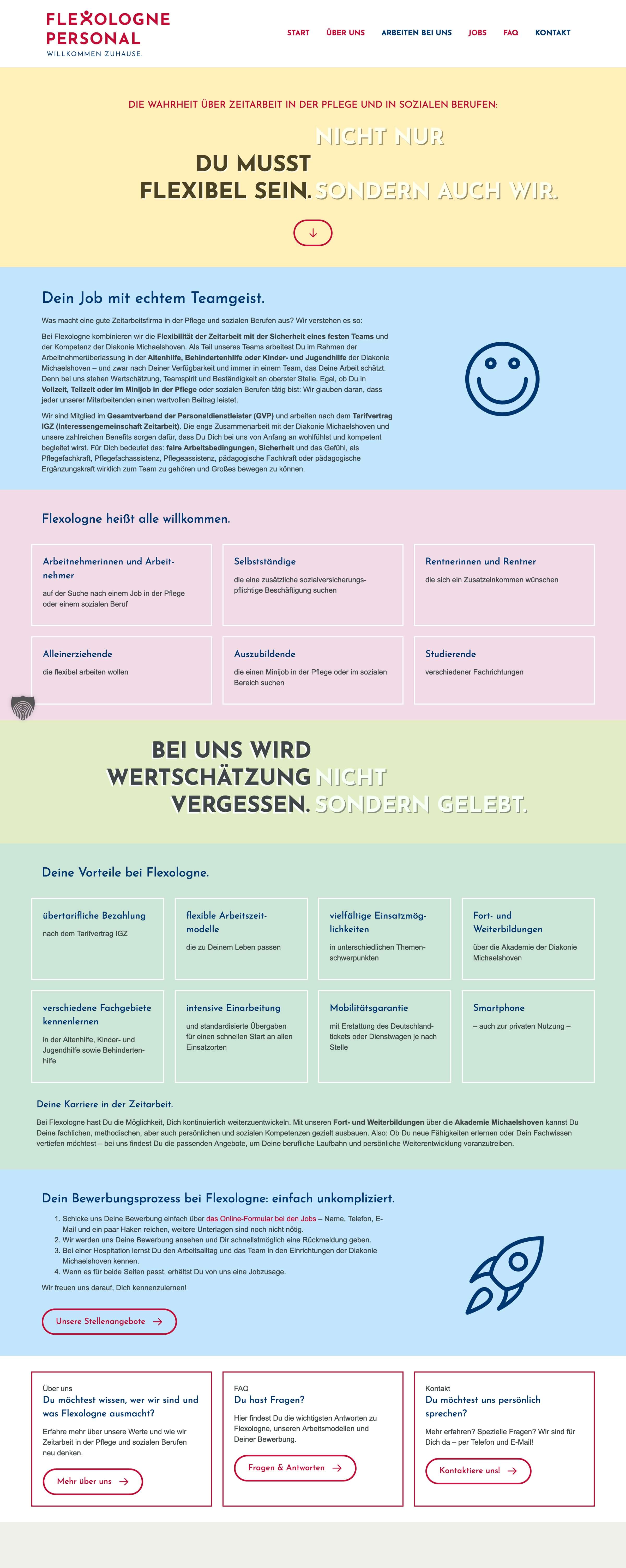 Flexologne Personal is Diakonie Michaelshoven’s temporary staffing agency, placing qualified professionals in nursing and social care roles across Cologne and the surrounding area—with the aim of rethinking temp work and offering employees a real professional home. We developed the website structure and copy, and wrote headlines for a consistent concept that plays with common prejudices about temporary work while highlighting the benefits of Flexologne.