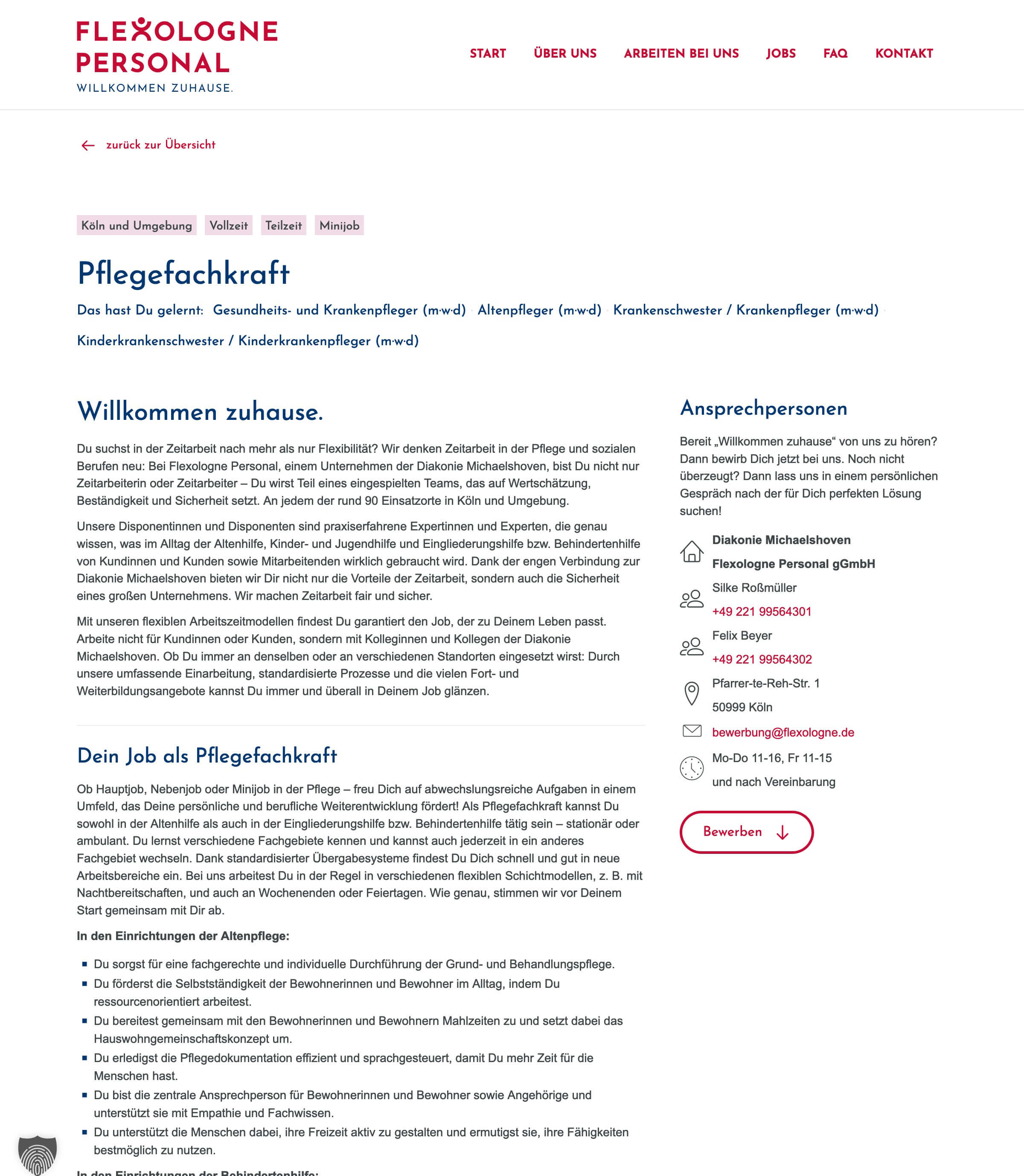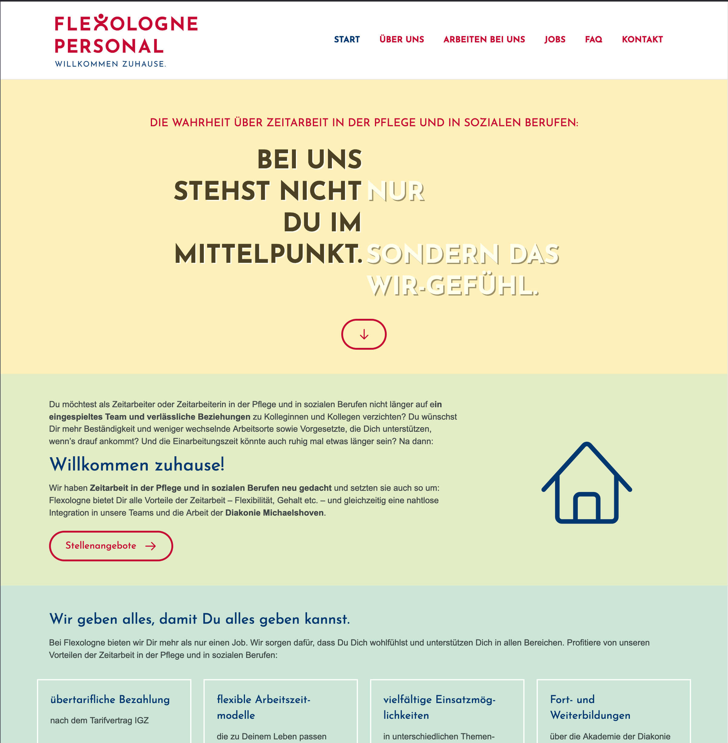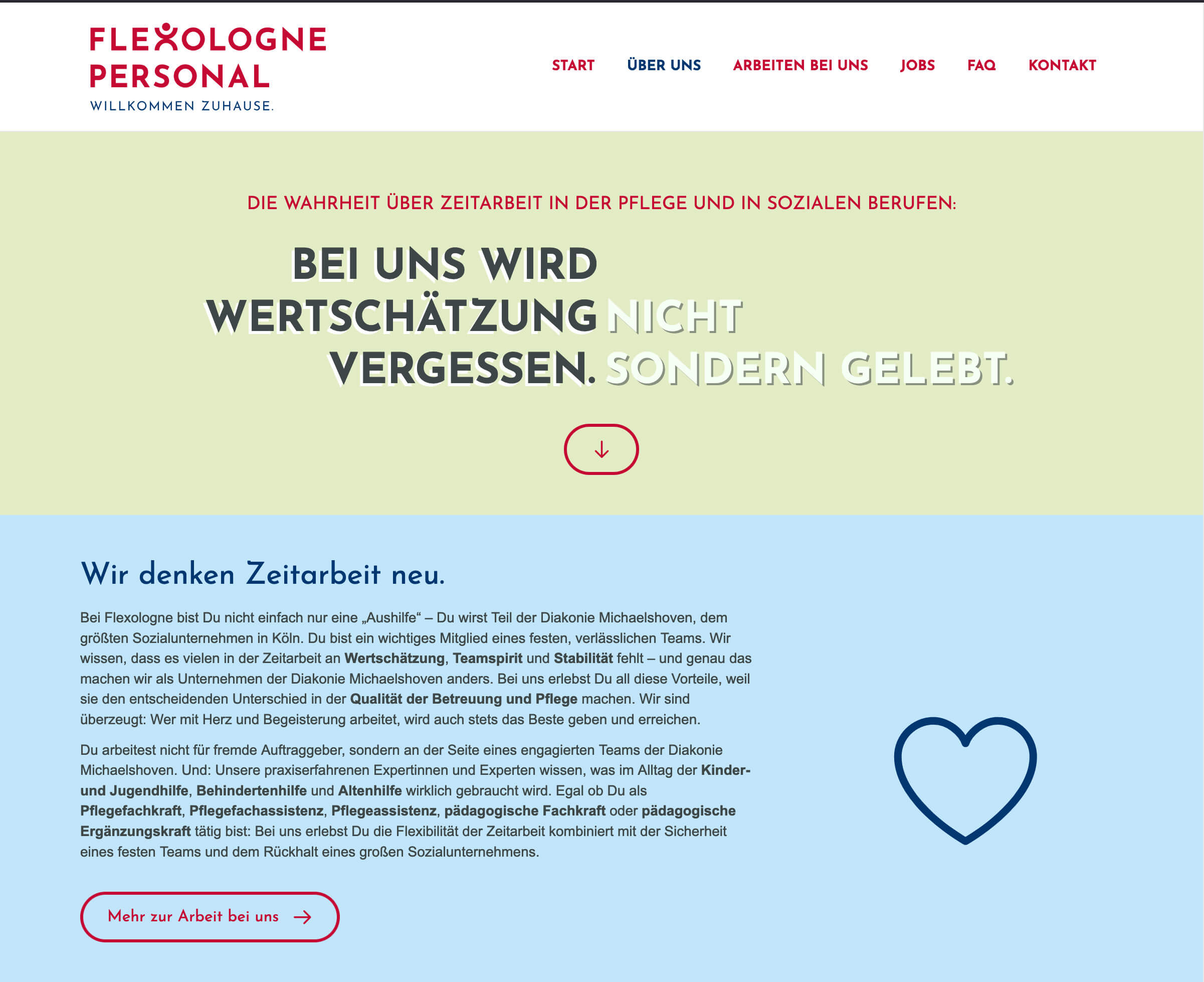Flexologne Personal ist die Zeitarbeitsfirma der Diakonie Michaelshoven und vermittelt Fachkräfte in Pflege und sozialen Berufen in Köln und Umgebung – mit dem Anspruch, Zeitarbeit neu zu denken und Mitarbeitenden ein berufliches Zuhause zu bieten. Wir haben die Struktur und Texte der Website entwickelt und Headlines für eine Mechanik geschrieben, die mit den Vorurteilen gegenüber Zeitarbeit und den Vorteile von Flexologne spielt.