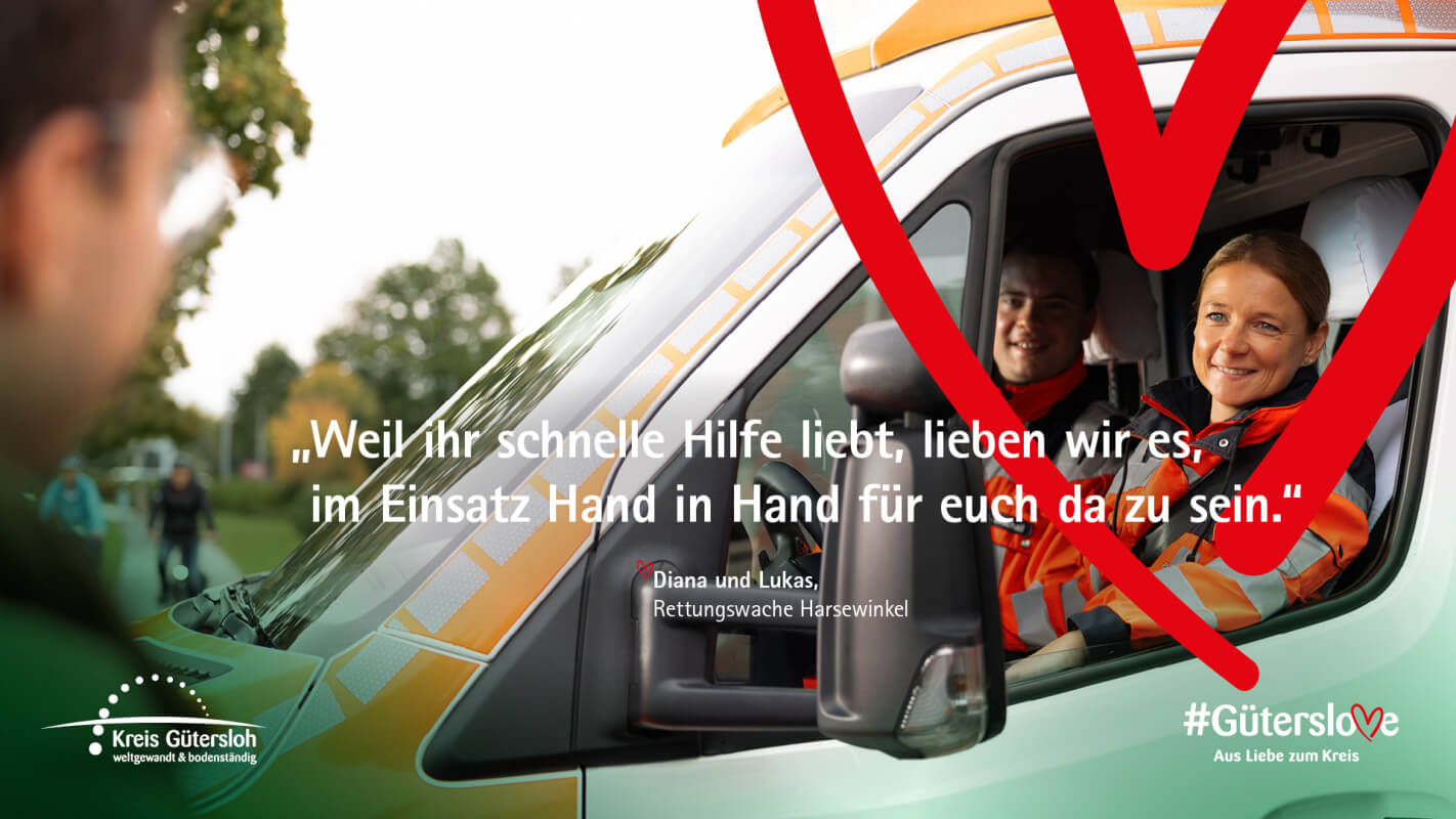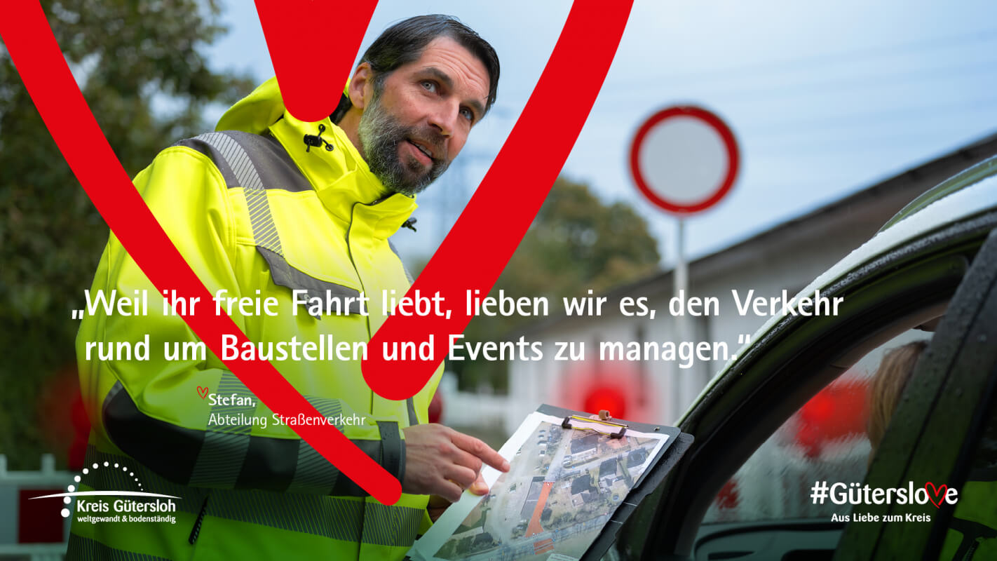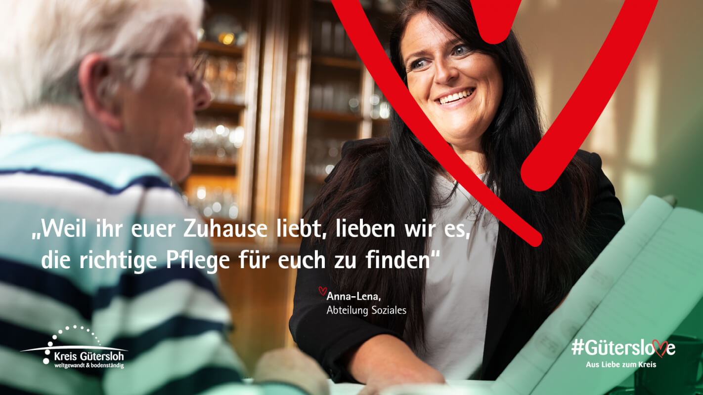 Unter der Arbeitgebermarke #Güterslove – Aus Liebe zum Kreis haben wir Kampagnenheadlines entwickelt. Die feste Mechanik: „Weil ihr Menschen im Kreis X liebt, lieben wir es, Y für euch zu tun.“ Getragen wird die Serie von echten Mitarbeitenden aus den Jobfamilien des Kreises – teils identisch mit den Testimonials aus den Jobporträt-Filmen. So entsteht ein konsistenter Auftritt, bei dem Botschaft, Menschen und Marke zusammenpassen.