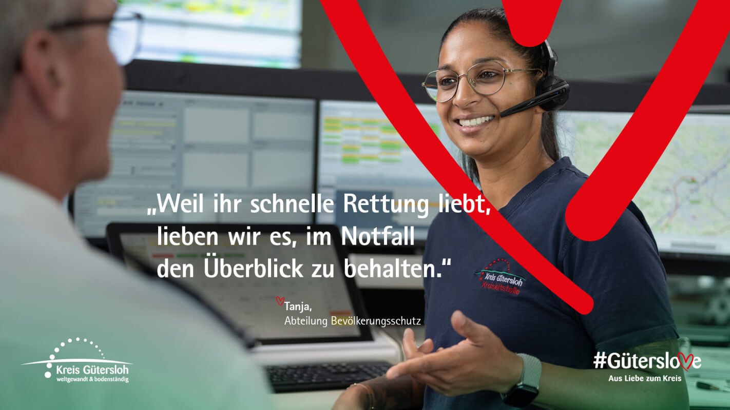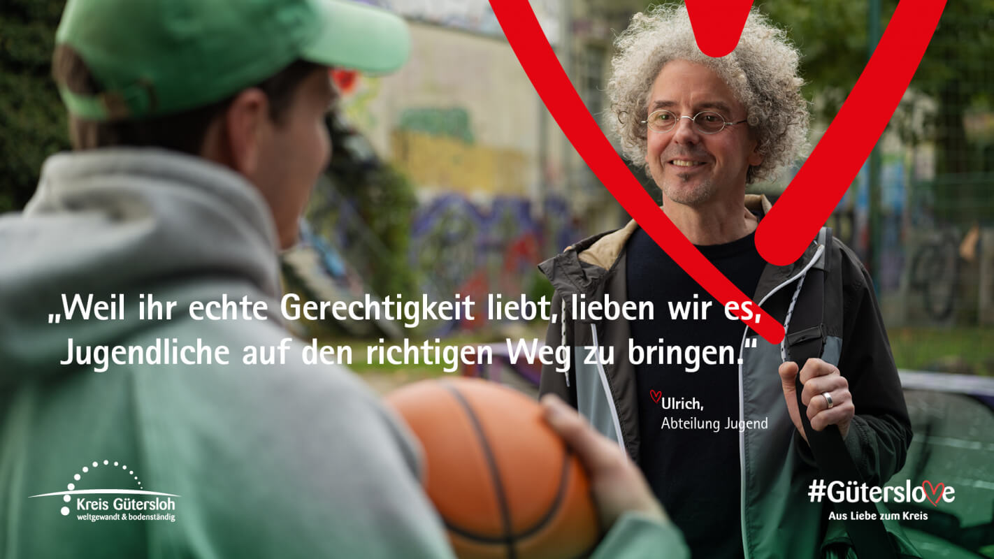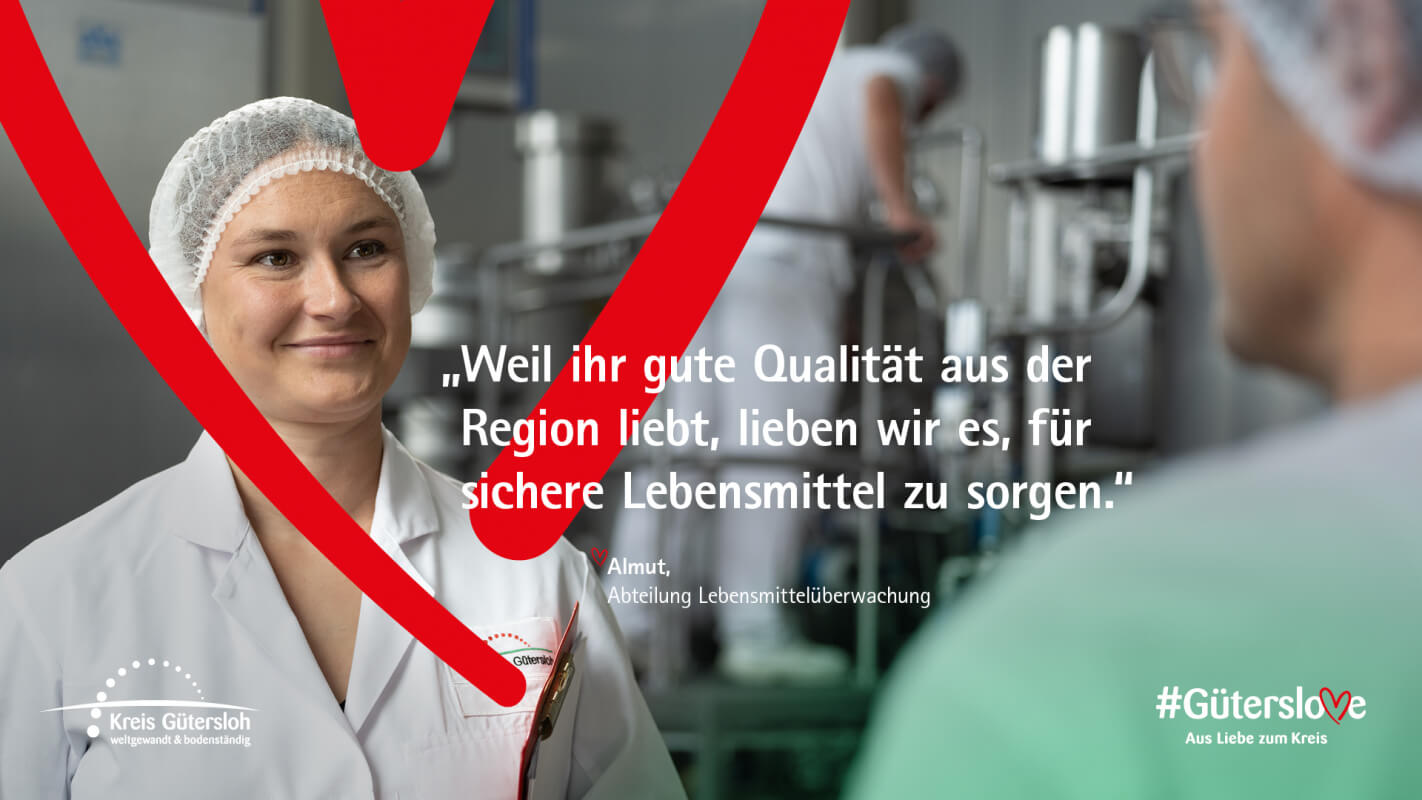 Unter der Arbeitgebermarke #Güterslove – Aus Liebe zum Kreis haben wir Kampagnenheadlines entwickelt. Die feste Mechanik: „Weil ihr Menschen im Kreis X liebt, lieben wir es, Y für euch zu tun.“ Getragen wird die Serie von echten Mitarbeitenden aus den Jobfamilien des Kreises – teils identisch mit den Testimonials aus den Jobporträt-Filmen. So entsteht ein konsistenter Auftritt, bei dem Botschaft, Menschen und Marke zusammenpassen.