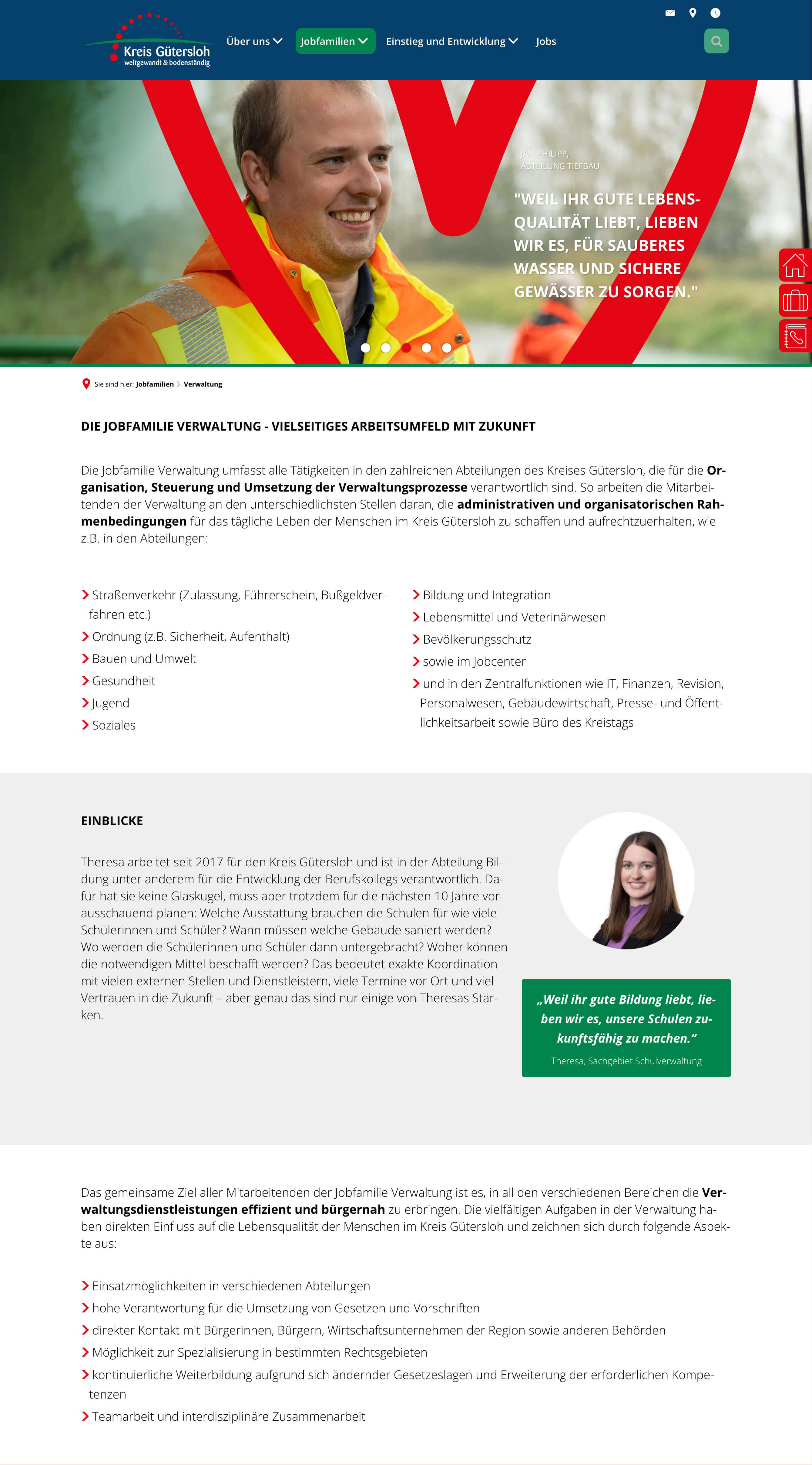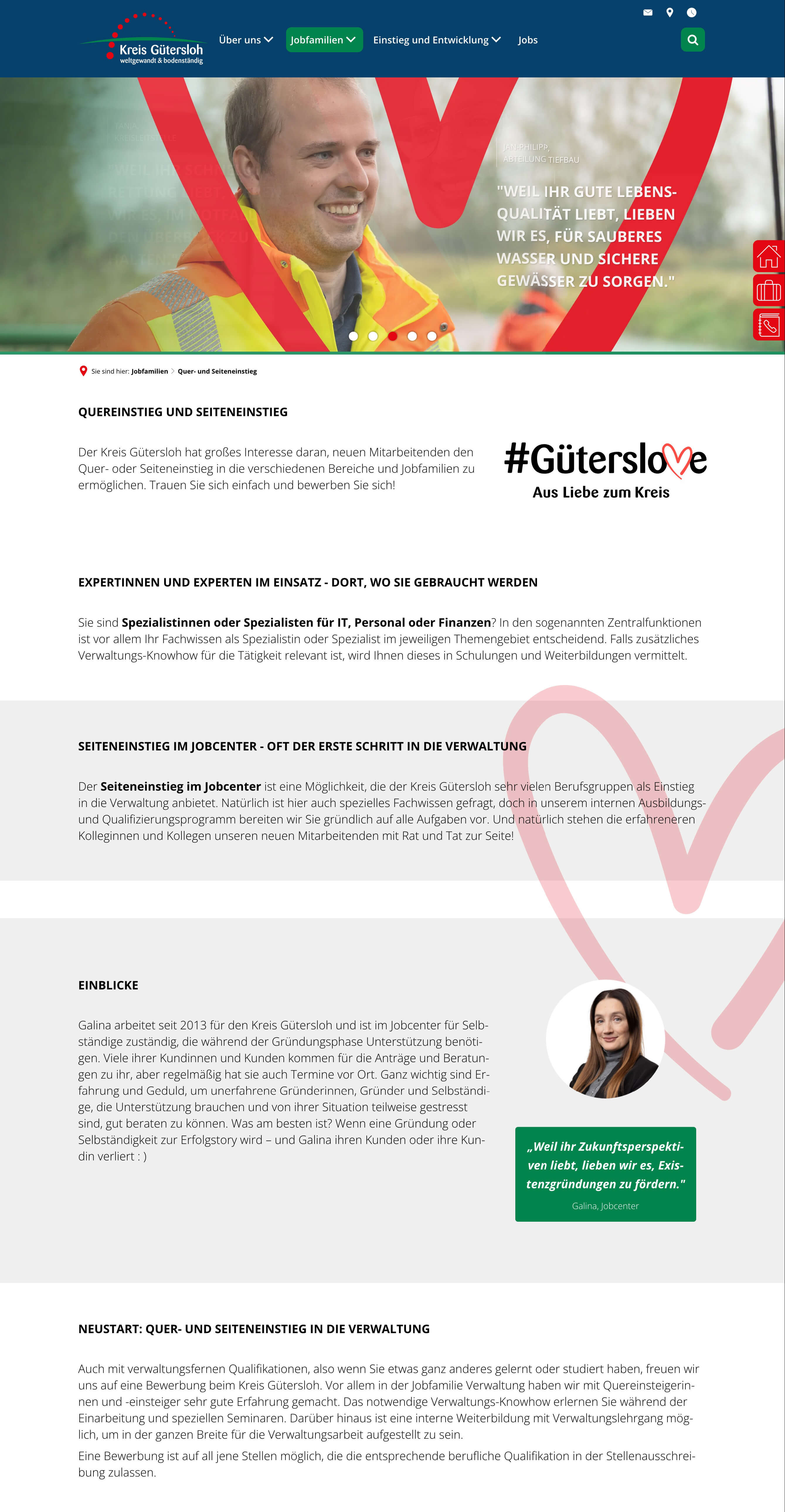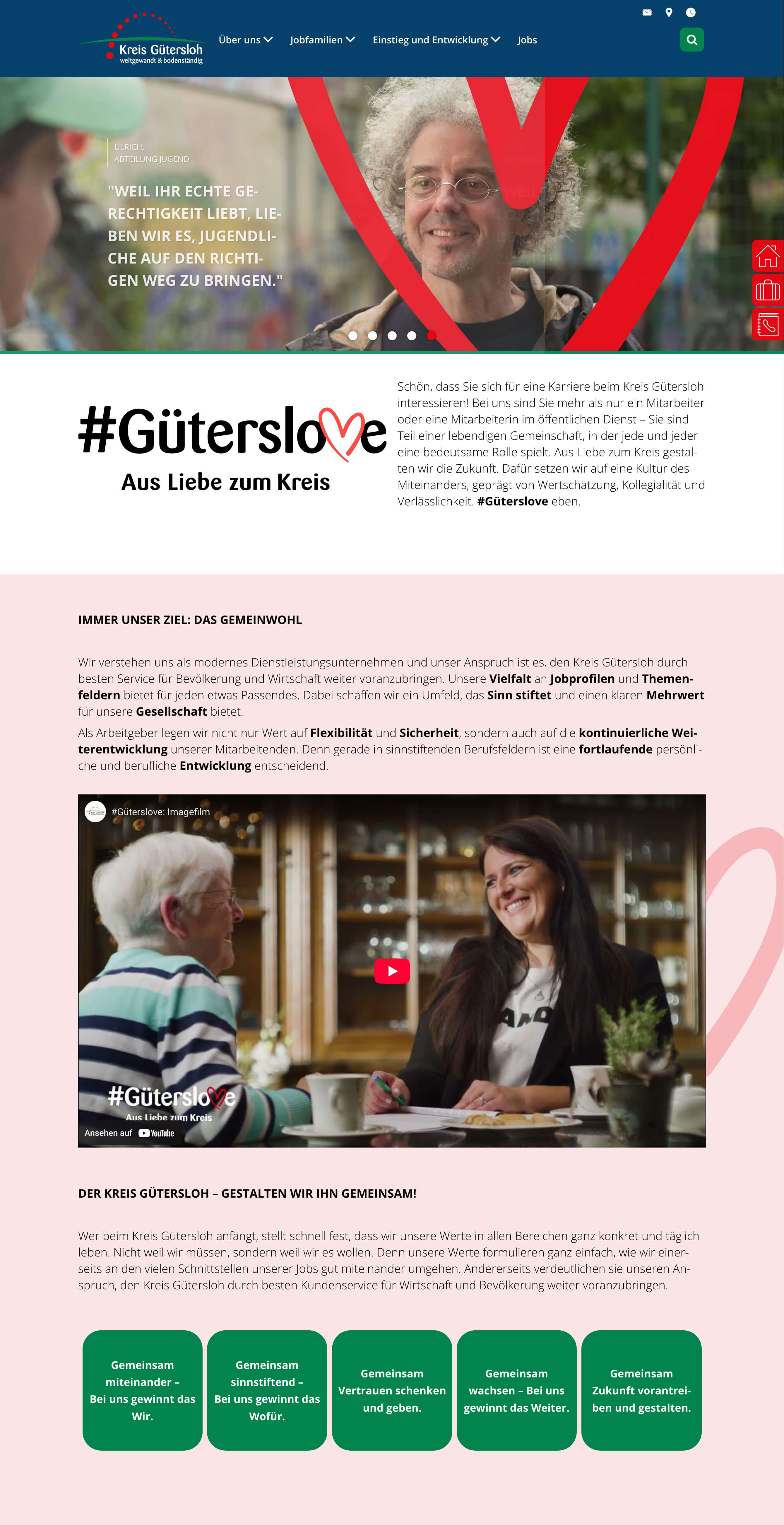 Der Kreis Gütersloh zeigt mit der Arbeitgebermarke #Güterslove – Aus Liebe zum Kreis, wie moderner öffentlicher Dienst heute aussehen kann und muss: gemeinschaftlich, wertschätzend und verlässlich – und mit dem Anspruch, die Region aktiv mitzugestalten. Darauf aufbauend haben wir Struktur und Texte der neuen Karriereseite und Stellenanzeigen entwickelt, die diese Werte konsequent transportieren und potentiellen Mitarbeitenden Lust auf den Einstieg machen.
